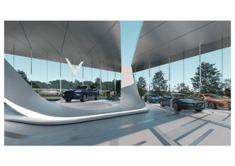 The design is inspired by the lines on the structure of the Vinfast car. The symbol "V" represents Vietnam, Vingroup, VinFast, and the letter "V" is also victory - victory. The letter V is exploited as the main structural system of the showroom. express a subtle and powerful expression of the desire to rise.