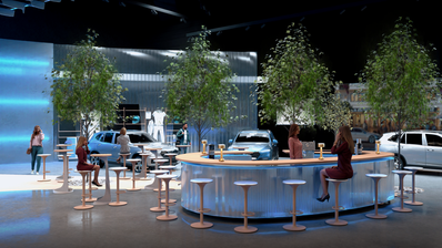 The showroom is set up as an immersive exhibition, with a central zone dedicated to the customer and combining the welcoming desk and bar and multiple interactive installations to discover the Vinfast car's design and technologies. From that central area, the visitors have an overview and free access to the cars staged around enhanced by the light.
